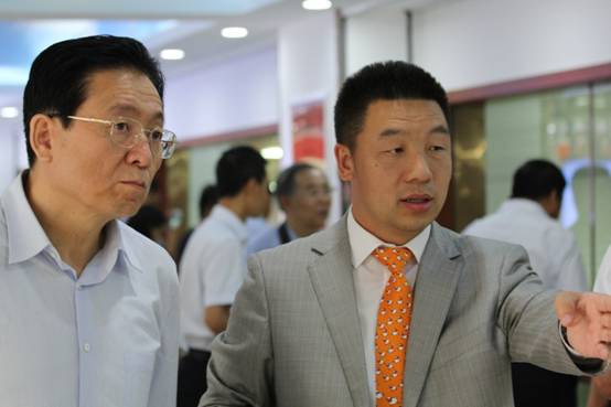 自治區(qū)農(nóng)牧業(yè)廳副廳長(zhǎng)云挨厚(左一)在蒙羊牧業(yè)總裁閆樹(shù)春的陪同下參觀(guān)考察生產(chǎn)線(xiàn)