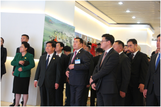 開幕式前,蒙古國(guó)大呼拉爾副主席桑吉米亞特布,自治區(qū)黨委書記、人大常委會(huì)主任李紀(jì)恒,自治區(qū)黨委副書記、自治區(qū)主席布小林,自治區(qū)黨委副書記兼政法委書記李佳,自治區(qū)農(nóng)牧業(yè)廳廳長(zhǎng)郭健等領(lǐng)導(dǎo)一行來到內(nèi)蒙古國(guó)際會(huì)展中心巡館。
