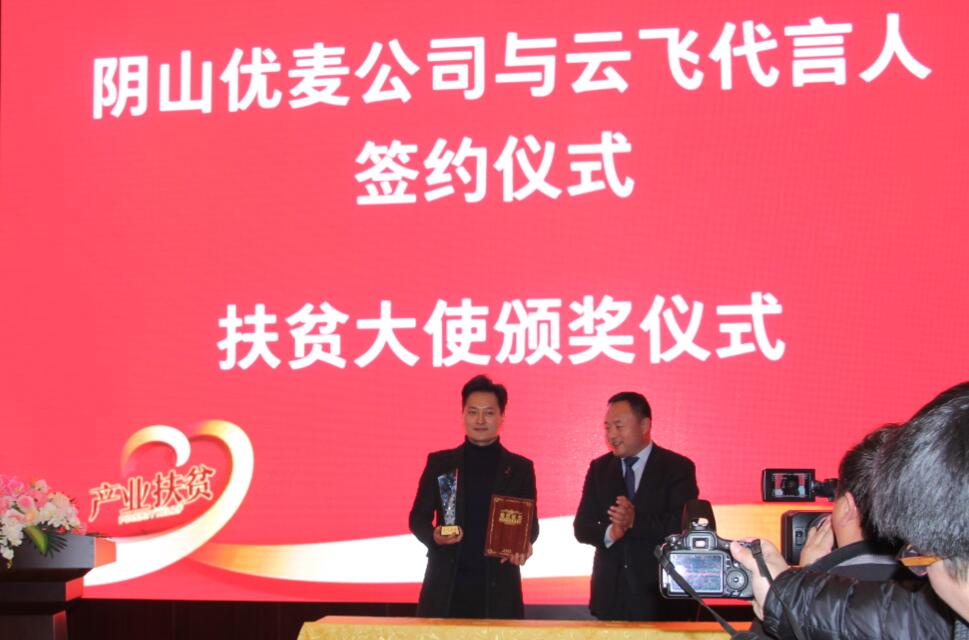 會上,陰山優(yōu)麥與云飛簽訂品牌代言協(xié)議,并由劉超旗長為云飛頒發(fā)“扶貧大使”證書和獎杯,并希望他發(fā)揮號召作用,繼續(xù)助推地方特色產(chǎn)品,提升市場認知度。云飛在發(fā)言中講到,內(nèi)蒙古的農(nóng)畜產(chǎn)品,尤其像陰山優(yōu)麥這種地方特色產(chǎn)品深受社會各界的喜愛。同時表示,作為公司的代言人,日后定會為產(chǎn)品的宣傳推廣作出積極的努力。