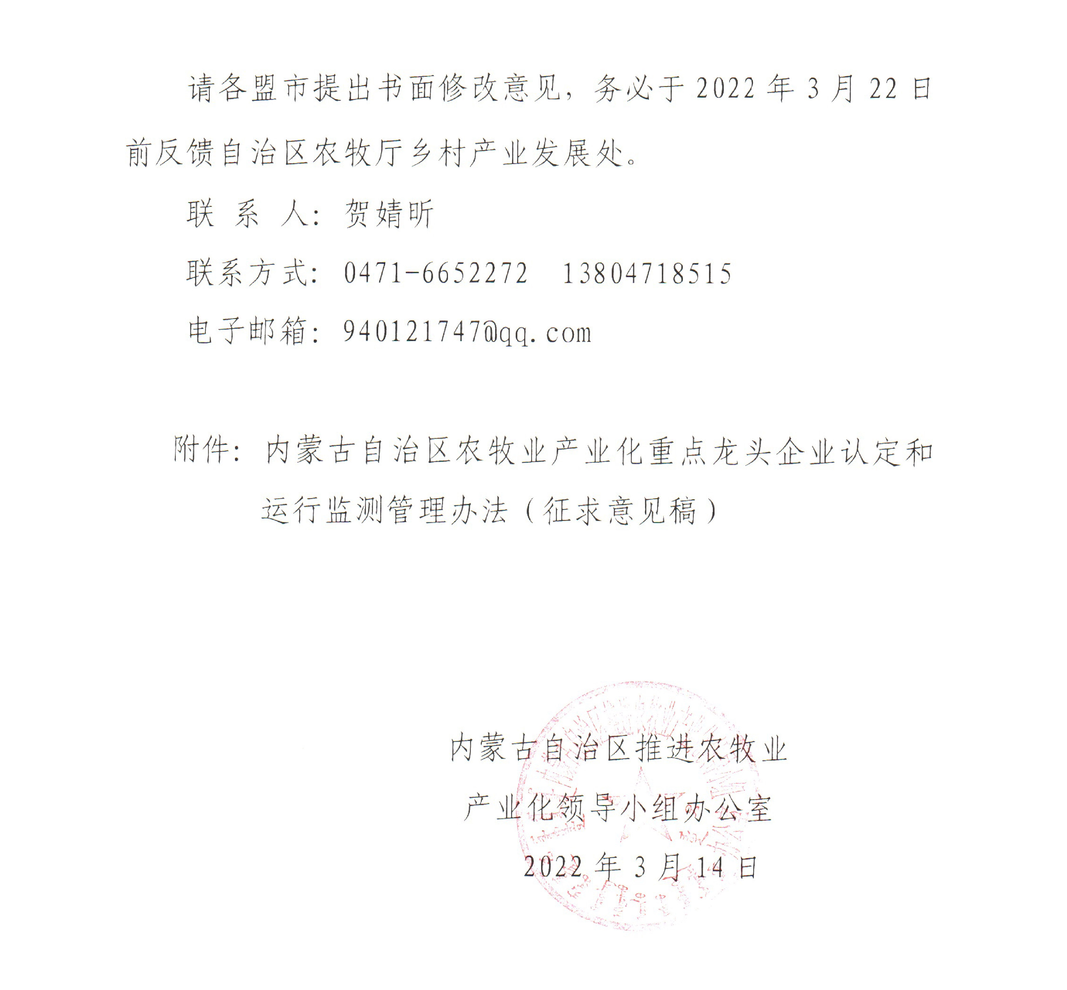 附件:關(guān)于征求修訂《內(nèi)蒙古自治區(qū)農(nóng)牧業(yè)產(chǎn)業(yè)化重點(diǎn)龍頭企業(yè)認(rèn)定和運(yùn)行監(jiān)測(cè)管理辦法(征求意見稿)》修改意見的函