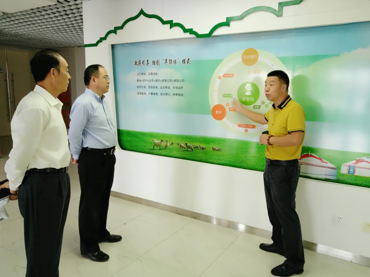 調(diào)研組一行首先參觀協(xié)會(huì)會(huì)長單位羊牧業(yè)股份有限公司,在聽取協(xié)會(huì)會(huì)長、蒙羊牧業(yè)副董事長閆樹春的介紹后,調(diào)研組一行詳細(xì)了解了蒙羊的“生產(chǎn)鏈”和“羊聯(lián)體”模式,并指出“羊聯(lián)體”模式是一種很好的模式,企業(yè)發(fā)展帶動(dòng)農(nóng)牧戶致富,并由企業(yè)出資擔(dān)保農(nóng)牧戶,降低銀行、保險(xiǎn)的風(fēng)險(xiǎn),這種模式既新穎又可控風(fēng)險(xiǎn)。調(diào)研組一行表示,今后銀行等各類金融機(jī)構(gòu)可以加大參與力度,讓金融資本更大程度上的支持內(nèi)蒙古農(nóng)牧業(yè)發(fā)展。