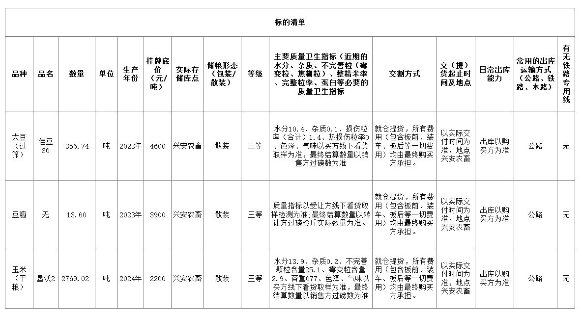 轉(zhuǎn)讓標(biāo)的為大豆(佳豆36)356.74噸、玉米(墾沃2)2769.02 噸、豆瓣13.6噸,標(biāo)的存放地位于呼倫貝爾市鄂倫春自治旗,詳情見(jiàn)標(biāo)的清單(含主要質(zhì)量指標(biāo)、存儲(chǔ)等信息):